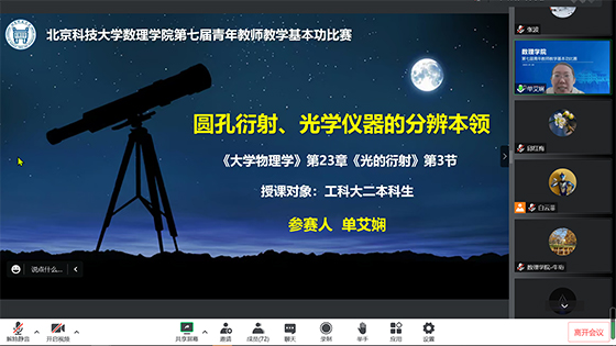 为进一步提高学院青年教师教学能力和水平,搭建青年教师学习交流平台,发掘新一代优秀青年教学骨干,bat365正版唯一官网分工会和教师发展中心联合组织的第七届青年教师教学基本功比赛于2023年1月5日通过线上方式成功举办。学院党委书记牛珩、院长庞晓露,校督导组专家代表,院、系班子成员,院教学委员会成员及北京市教学名师代表等31位专家参加了本次活动并担任教师评委,来自不同专业的8名学生担任学生评委。比赛由学院行政副院长白云菲主持。部分青年教师参加了教学比赛观摩。