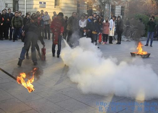 之后,在保卫处老师们的引导下,理化楼进行了消防疏散演练。演练过程中,师生们严格听从引导员指挥,认真按照老师提出的要求进行疏散,整个现场井然有序,3分38 秒全部疏散完毕。随后,保卫处的老师们又在理化楼广场向师生们讲解和示范灭火器的使用,许多老师和同学都现场操作了灭火器的使用,大家感到受益匪浅。